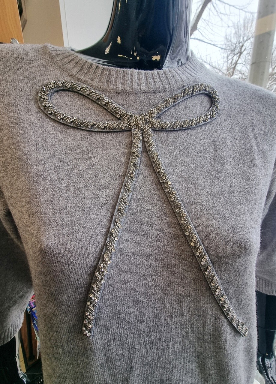 - Тази рокля представлява елегантно и уютно съчетание от плетена материя, класически сив цвят и бляскав декоративен акцент. Тя е идеална за есенно-зимния сезон, съчетавайки комфорта на плетивото с изискан и женствен завършек.
